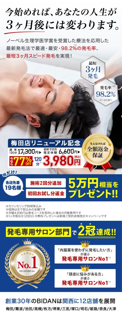 一方、少し時間をかけてでも、自分の髪にこだわり薄毛ではなかったあの頃の自分を取り戻したい方は、育毛に特化した育毛サロンをお勧めいたします。